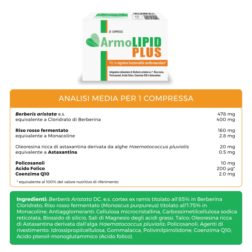 ARMOLIPID PLUS -Il n.1 in farmacia tra gli integratori per il controllo dei livelli di colesterolo° (*Numeri Sell-Out Valore Tot. Italia (NEC2 10F REGOLATORI DEL COLESTEROLO/INTEGRATORI) - november 2023 - October 2024. Fonte: IQVIA Pharmatrend, mercato regolatori colesterolo (NEC 10F) - Farmacia, Parafarmacia, Corner GDO e E-Commerce, dati a valore, periodo novembre 2023 - ottobre 2024. Copyright 2024, reprinted with permission. All rights reserved).